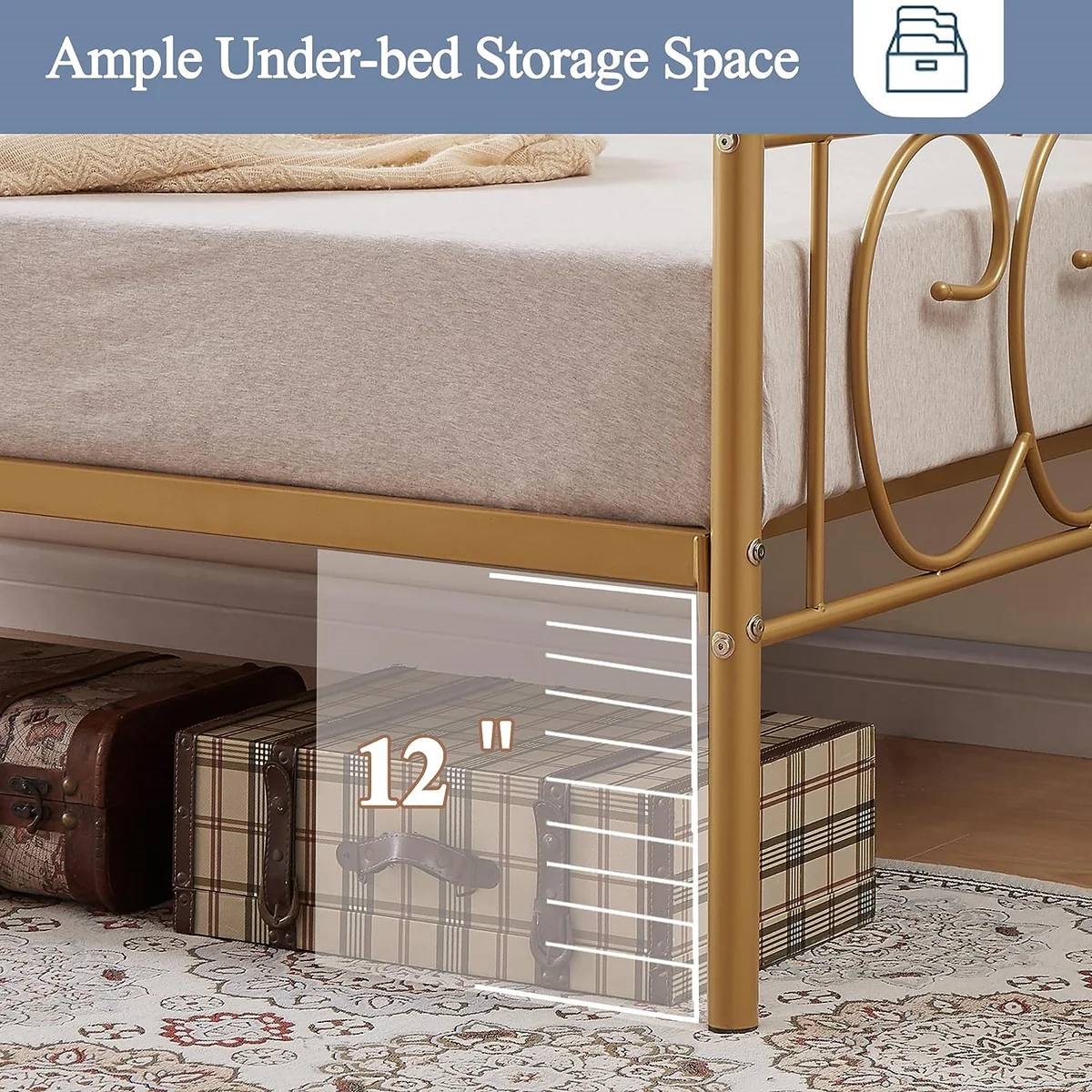 This Twin size French Country Style Gold Metal Daybed Frame structured with heavy-duty metal ensures durability and stability. Strong mattress foundation and no box spring needed. No mattress. 13 inches storage space under the twin daybed frame, offers more space for you to place an organizer container or storage box to tidy your clothes, toys, or quilts. This multifunctional twin size daybed frame can easily match a variety of home decor styles. It is an ideal choice for your bedroom, kids room, guest room, or living room. Twin size daybed frame dimensions: 79 X 41 X 39 in. Our daybed frame has a classic decorative appearance, giving you a comfortable sleeping experience. All parts are clearly labeled, please just follow the instructions and install this twin size daybed frame step by step. 2 people are recommended to install.