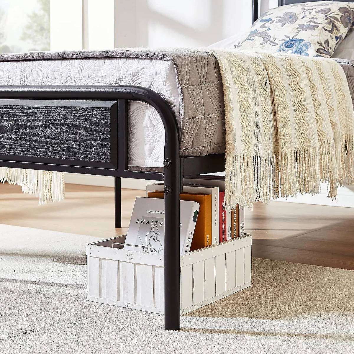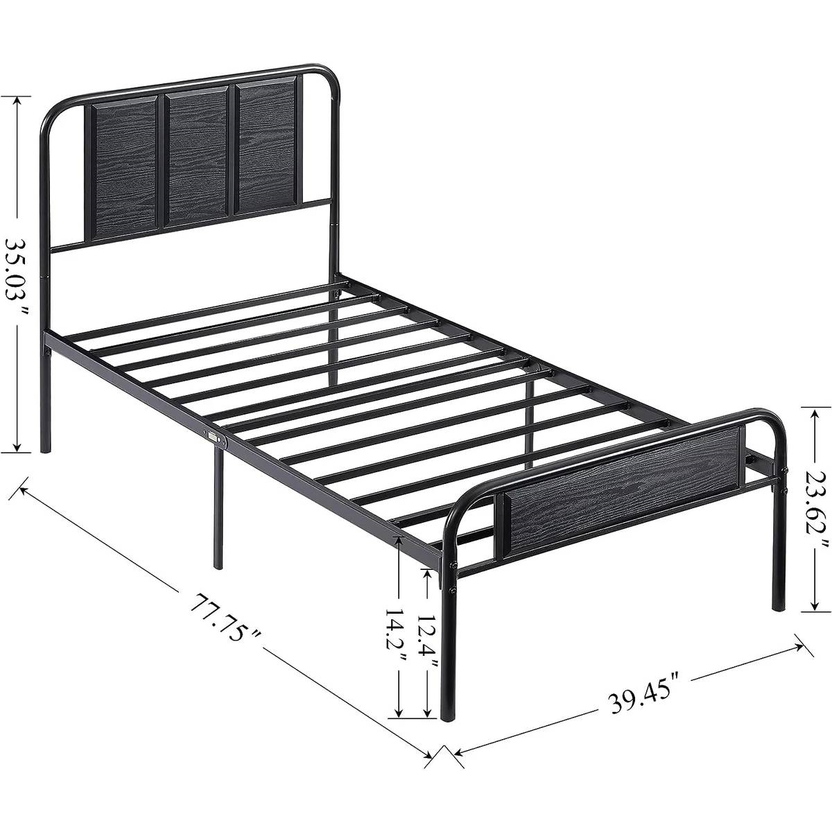 Modern-industrial design crafted by MDF wood with striking natural wood grain on the wood-paneled headboard and footboard. It is easily blended with modern, traditional, farmhouse, and rustic home decor. This Twin Black Wood Metal Platform Bed Frame with Rounded Headboard Footboard is a sleek finishing touch to your bedroom. This bed frame is built with reliable 9 metal support legs and 13 pcs of heavy-duty steel slats which provide strong support to your mattress. The powder-coated surface features scratch resistance for long term use. Sturdy steel slats support with foam padding inside prevent mattress sliding. No squeaky when you are rolling over at midnight. Plastic foot pad attached to the bottom of the bed frames for floor protection. 12.3 inches Underbed Storage Space brings you spacious storage space and easy cleaning. Sufficient storage space provides you valuable storage room for extra odds and ends. The assembly instructions were so clear and easy to follow, Every part is clearly labeled and numbered. you can install this bed by yourself in half an hour. Mattress not included.
