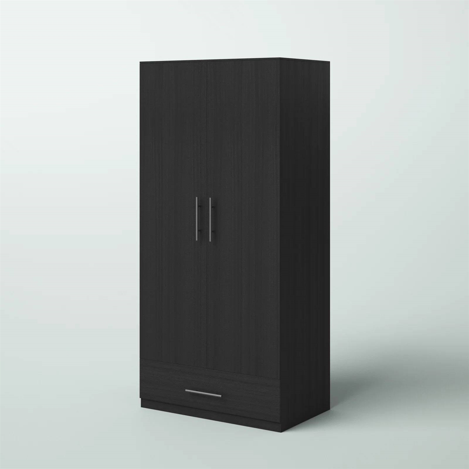 Whether in the main bedroom or any spot in your home, this Modern Armoire Wardrobe Closet Cabinet with Storage Drawer in Black Wood Finish helps keep your wardrobe organized and makes getting ready in the morning a breeze. It has a clean-lined modern silhouette, and it's made from engineered wood with a rich neutral finish. We love how this tone complements almost any aesthetic, color scheme, or pattern. Two large doors open to reveal a spacious interior with a metal rod to hang jackets, slacks, and more. A lower drawer provides even more room to place clothes and other accessories. For extra stability, we recommend getting a wall anchor sold separately.
