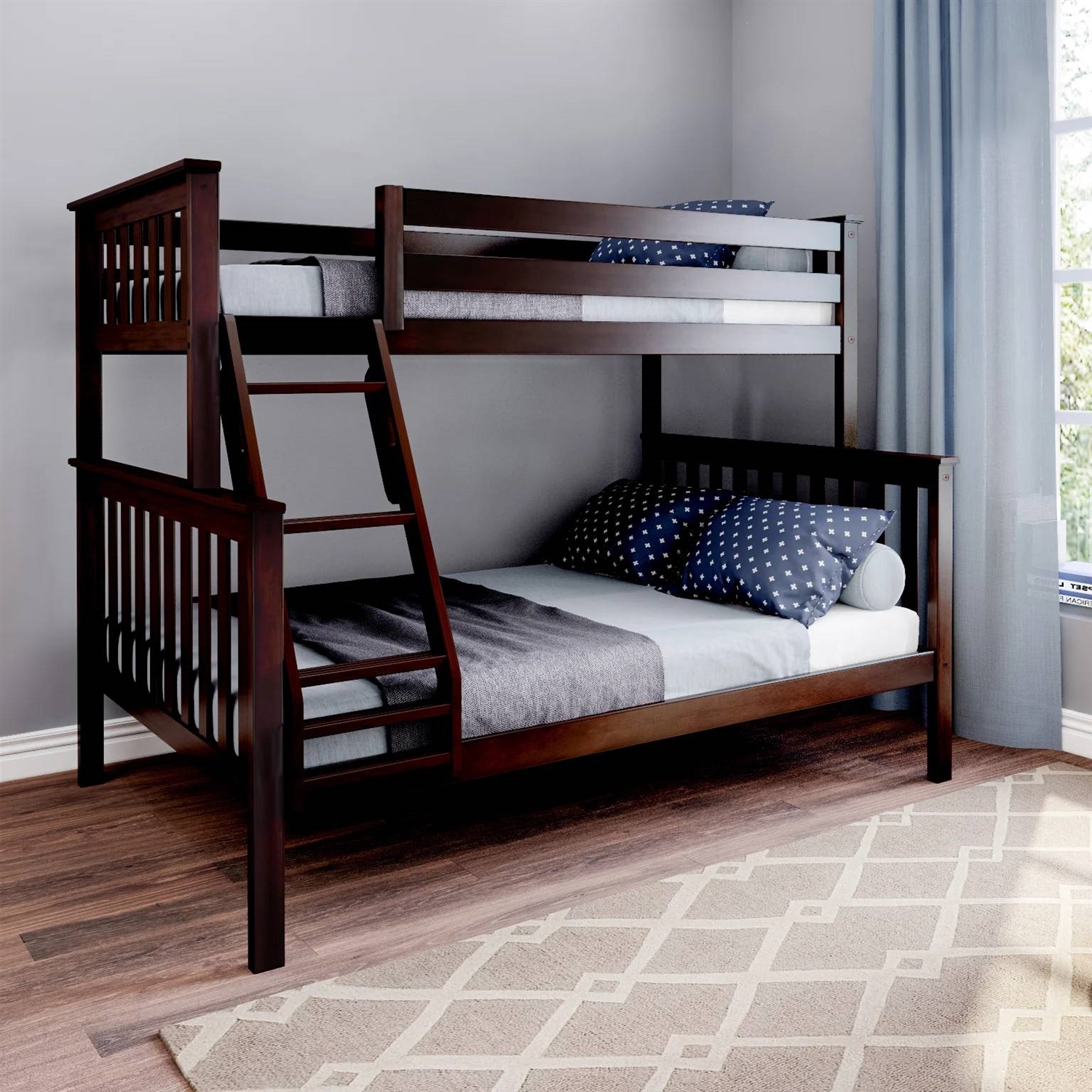 • Twin over Full size Solid Wood Bunk Bed in Espresso Brown Finish