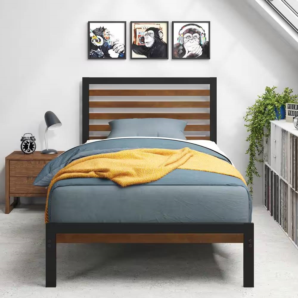 The Twin Student Dorm Black Metal Platform Bed Frame with Brown Wood Slat Headboard is beautifully designed to fit your industrial or modern aesthetic. Its slatted headboard and low-profile footboard are both made from beautifully finished sustainable bamboo, while the rest of the frame is constructed with sturdy steel. With its clean-lined silhouette, this modern bed enhances your primary suite, kid's room, or guest room with style and function. Designed for use without a box spring, you can rest your mattress directly onto the metal slats for long lasting support. All parts, tools, and instructions are neatly packed into a single box that ships right to your door for quick and simple setup. With the Twin Student Dorm Black Metal Platform Bed Frame with Brown Wood Slat Headboard, meshing your style with a dependable and affordable piece of furniture can be easier than you think.