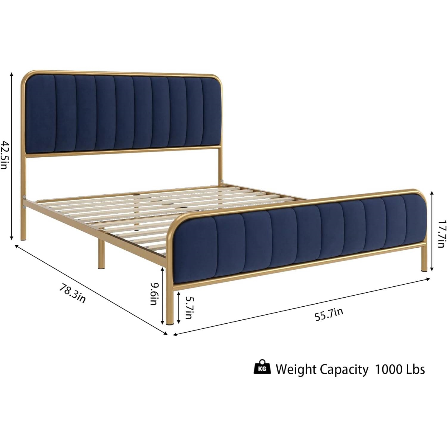 With a tufted headboard design and golden metal foundation, this Queen Gold Metal Platform Bed Frame with Navy Blue Velvet Upholstered Headboard will look classic in any bedroom. Perfect for modern bedrooms, the upholstered platform bed frame is not only stylish but functional as well. The soft-packed part of bed frames’ padded headboards are made of high-quality Velvet wrapped with high resilience sponge, perfect for sitting on this bed to read the books or playing an iPad. This is a comfortable height. 9.6 inches storage space beneath the bed frame, put some boxes or clothes or shoes for you, it can make room more tidy. The platform bed is made of a premium metal frame. 12 pcs strong wood slat support which provides firm, rigid support to your mattress. Ensures no shaky, squeaky and noise. Sturdy as well as pretty. Load Capacity up to 1000lbs. Everything you need for assembly comes zipped up in a compartment behind the headboard for convenience. No additional tools or parts are needed. Start to enjoy the fun of DIY according to the clear instructions. (PLEASE NOTE: MATTRESS SOLD SEPARATELY).