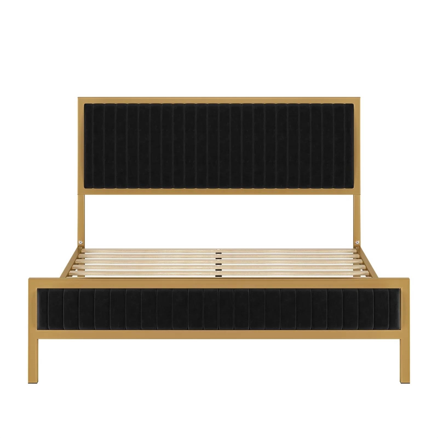 • Full size Gold Metal Platform Bed Frame with Black Velvet Upholstered Headboard