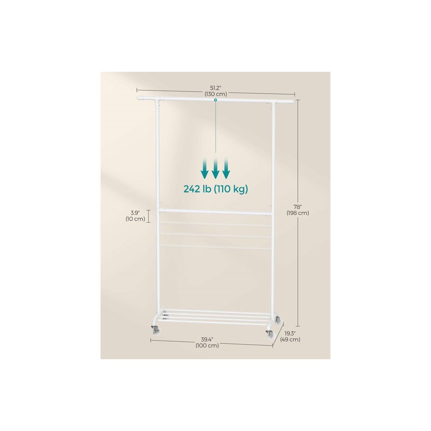 The rustic and industrial design makes this Modern Industrial White Metal Tube Garment Rack with Bottom Hanging Rod a decorative piece for clothing stores, boutiques or retail businesses. With center rail adjustable at 4 heights, it is perfect for keeping long or short garments in an organized way. The wheels make the clothes rack incredibly practical so you can easily transport clothes around your store or studio. Works as a clever solution to store all your piled up clothes without taking up a large amount of floor space. This super cool and stylish pipe garment rack works well in a loft apartment with no closet space. For exceptional built quality, high weight capacity and convenient mobility - look no further than Industrial Pipe Double Rail Garment Rack. No matter if you have a cool rustic apartment or a feminine home, this trendy industrial-inspired clothes rack will be a statement piece, also displays garment stylishly in boutiques or secondary markets. Premium metal tubes ensure stability and superior strength with a 242 lb total weight capacity; for hanging your heaviest winter jackets or chic cocktail dresses, this clothing rack is a must-have. Adjust the middle rail among 4 different heights (while the total height remains fixed), hang coats or long dresses on the top rail, and ready shoes or bags on the bottom shelf—this rack keeps everything in one place. Slide this clothes rack with 4 wheels to a dressing mirror for checking out your outfit, lock it in place when you complete your morning routine, or roll it around backstage for handling numerous costume changes. Assembly shouldn’t be an annoying task—with clear instructions, labeled parts, and assembly tools included, you’ll have this clothes rack set up before you know it.