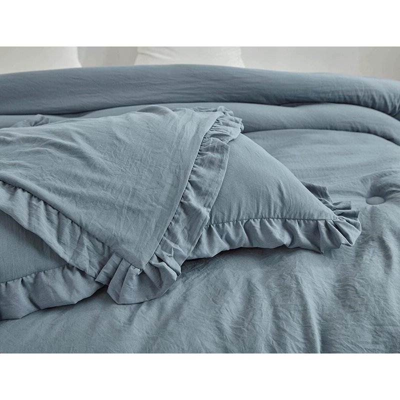 Transform your bedroom in a sophisticated and luxurious manner with this King Oversized Blue Stone Washed Ruffled Edge Microfiber Comforter Set. An attractive ruffled edge trim with an elegant yet simple presentation that makes you feel right at home. Fashionably providing everyday comfort. Lightweight, high loft comforter with adequate warmth for year-round use. The comforter is made of 100% microfiber polyester, giving a super soft smooth, and cozy feel. The fabric is stone-washed which creates a natural attractive crinkled fabric effect to enhance the aesthetics of the comforter.