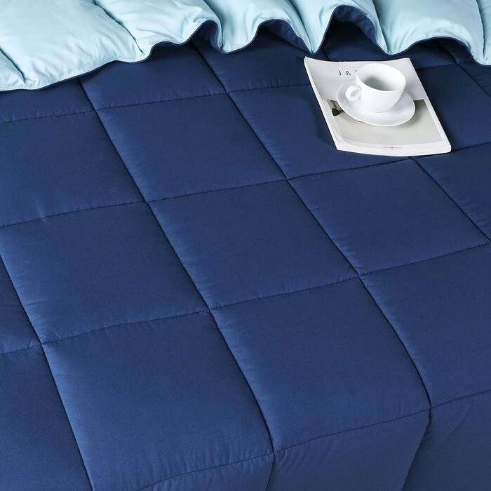 Update your bedroom with this King/Cal King Traditional Microfiber Reversible 3 Piece Comforter Set in Blue/Navy. This comforter set has nice double stitching overclock with piping making it elegant and luxurious. Crafted from microfiber polyester, this fade- and stain-resistant set can be tossed into the washing machine and dryer for fuss-free upkeep. The baffle box construction crafted with high-density needle stitching prevents the fiberfill from shifting, even after a wash.