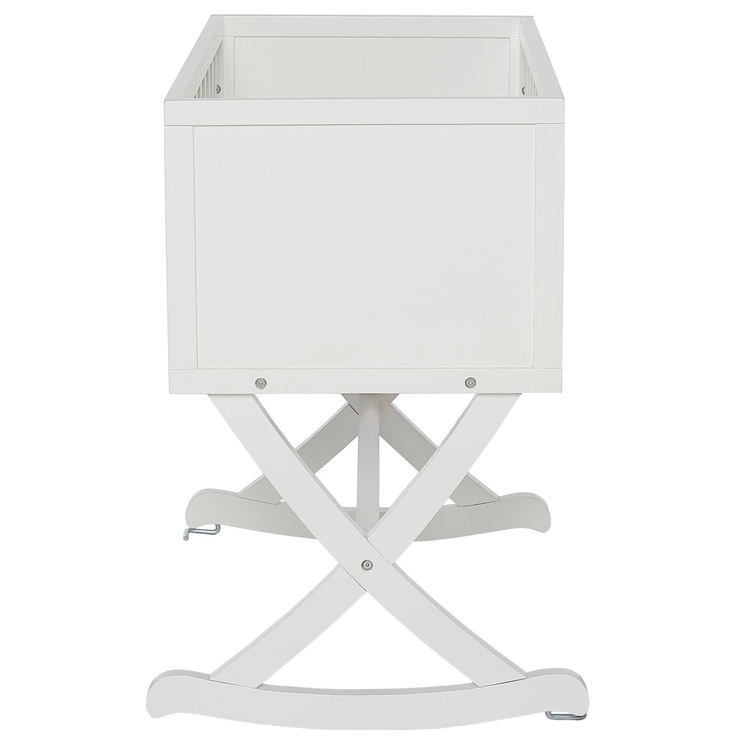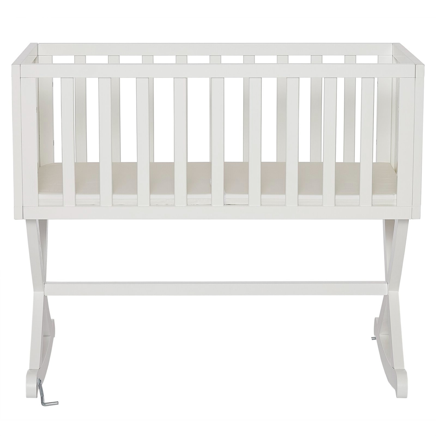 This Solid Wood Rocking Baby Glider Cradle with Crib Mattress in White Finish creates a cozy nest-like surrounding for your newborn. This cradle offers a simple and modern design by incorporating straight lines, a solid side panel with a soft mattress pad, and an x-cross base, which allows parents to rock gently their babies to sleep with sophisticated iron decors and pops of geometric prints that inspire a plush, peaceful, all-night comfort.
