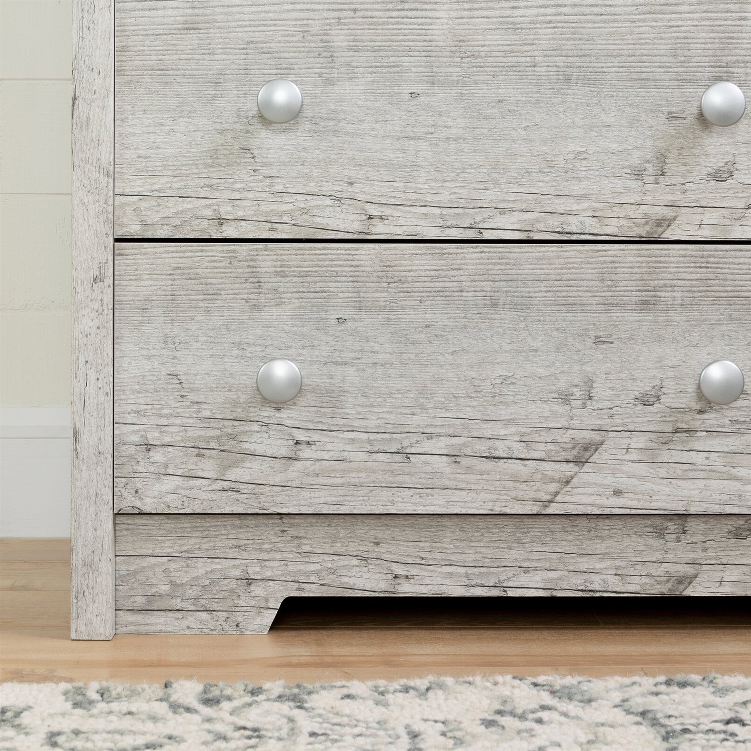 Bring rustic nautical charm with this stylish changing table turned dresser to add coastal flair to any room. The Farmhouse Nautical 3 Drawer Rope Handle Baby Changing Table in Washed Pine is sure to be the centerpiece of your nursery, and its handy storage spaces make it really useful. The top drawer features an easy to pull rope-like handle and the bottom two drawers with cute knobs. Versatile Storage This changing table features 3 large drawers with smooth metal slides for quiet and easy access.