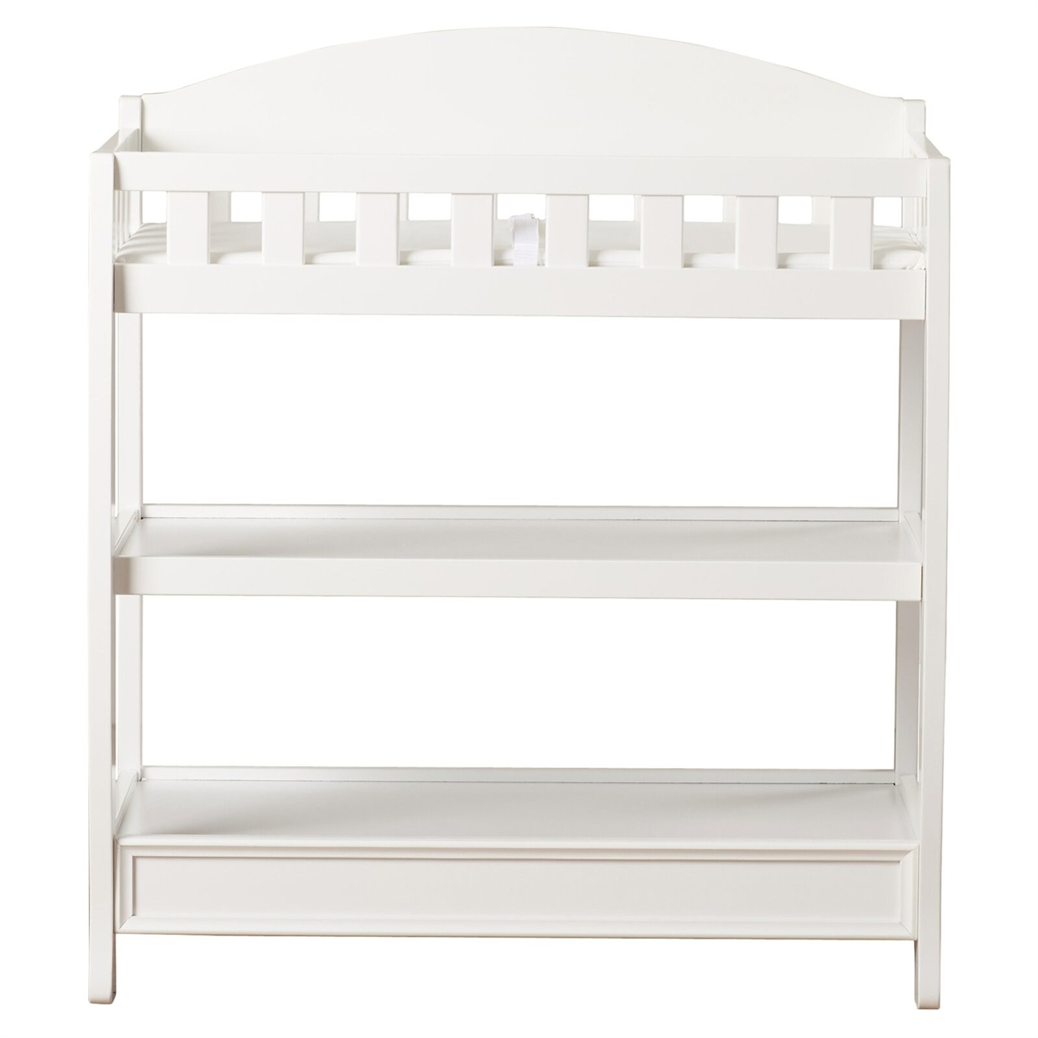 Modern White Wood Changing Table with Pad does it right by parents and babies with this incredibly versatile changing table! Featuring 2 fixed shelves for flexible storage, this sleek changer includes a water-resistant changing pad and a safety strap, plus security rails on all sides.