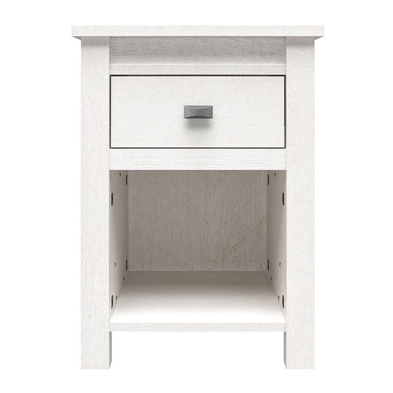 Complete your bedroom with the Farmhouse 1-Drawer Bedroom Nightstand with Open Shelf in Rustic Off-White Oak. This sturdy Nightstand is constructed of laminated particleboard and MDF with a white woodgrain finish. The Nightstand offers one drawer for concealed storage and an open cubby for storage for books or decorating accessories. Complete your bedroom with other beautiful pieces (each sold separately).