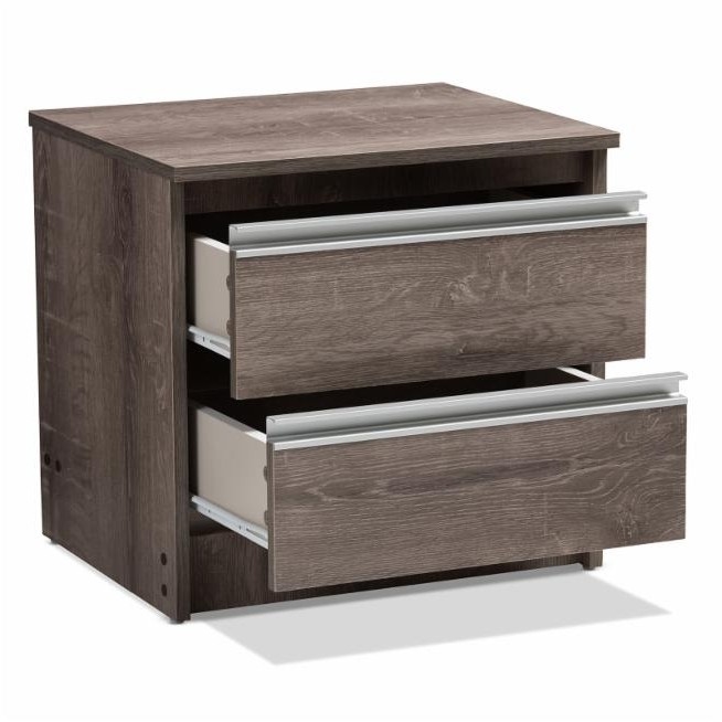 Rustic simplicity is the theme of this Rustic FarmHome 2 Drawer Nightstand Natural Oak. This nightstand boasts a sleek shape as well as a natural oak finish. Woodgrain detail ensures an authentic look that lasts. Two drawers offer ample storage space and are complete with silver metal drawer pulls for easy open/close