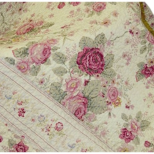 This Red Pink Gold Ecru Floral Roses Quilt Throw Blanket in 100% Cotton features surface texture and warm colors. The deep ecru fabric features garden roses in rich red and gold hues. Framed and reversed to a coordinating striped fabric. Finely stitched for durability and scalloped along the edges. 100-percent cotton. Throw measures 50-inch by 60-inch.