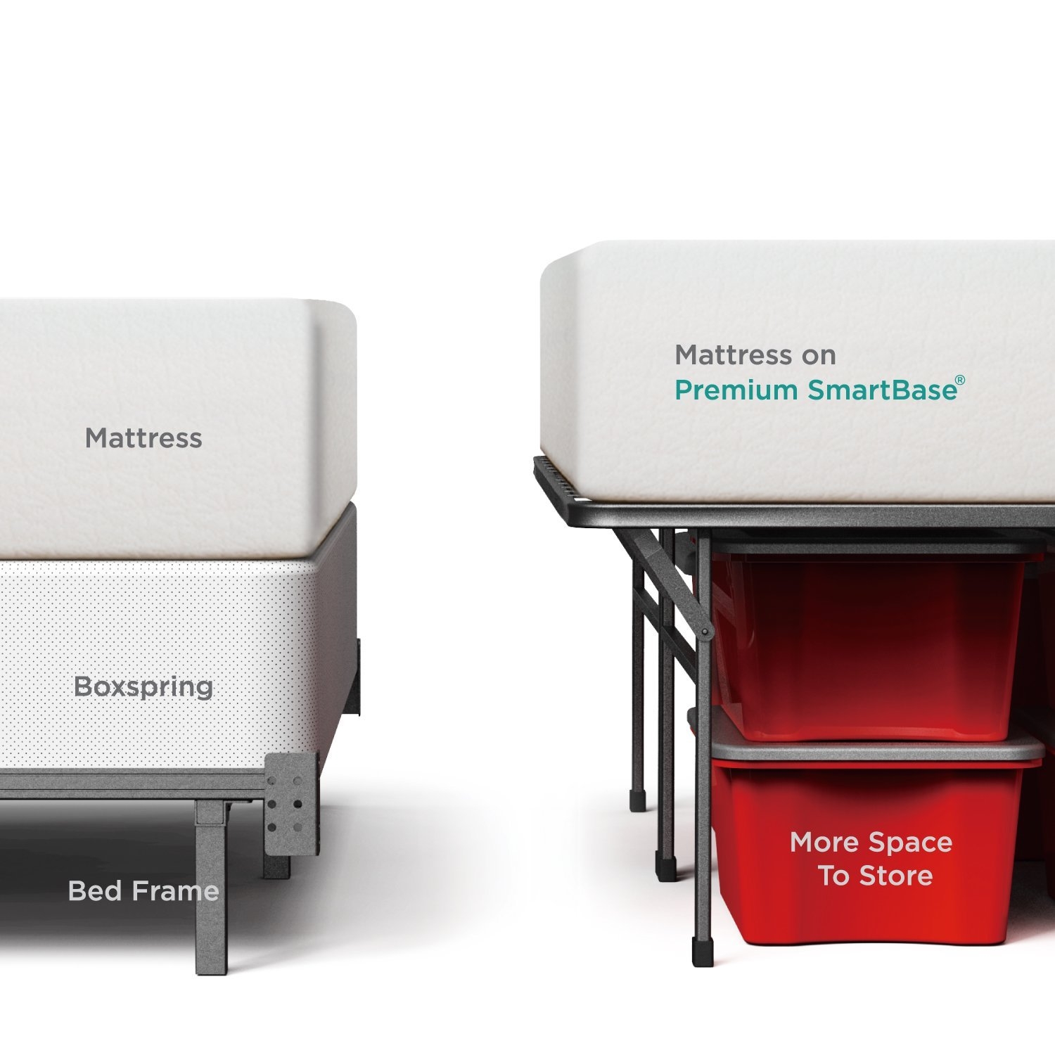 This California King size 18-inch High Rise Metal Platform Bed Frame with Under Bed Storage Space eliminates the need for a box spring as your memory foam, spring or latex mattress should be placed directly on the Base. The base works especially well for lower profile 6, 8 and 10 inch mattresses, giving your bed a ‘lift” for extra storage as well as ease of use. Uniquely designed for optimum support and durability the strong steel mattress support has multiple points of contact with the floor for stability and prevents mattress sagging, increasing mattress life. The California King size 18-inch High Rise Metal Platform Bed Frame with Under Bed Storage Space is 18 Inches high with 17 Inches of clearance under the frame for 4 extra Inches of under-bed storage space. With plastic caps to protect your floors and an innovative folding design to allow for easy storage, the Base is well designed for ease of use. Worry free 5-year limited warranty.