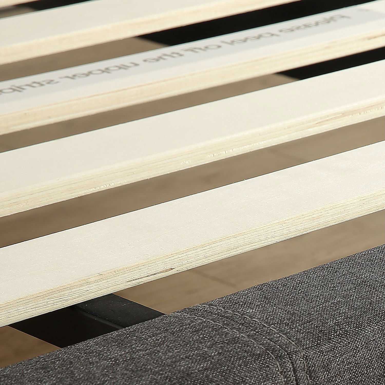 This King size Modern Grey Upholstered Padded Platform Bed Fame is a minimalistic, stylish bed base that works well with a variety of decorating styles and lets you easily update the look of your room. Top-quality grey upholstery covers this platform bed frame. A box spring is not necessary with the Essential Platform Bed as wooden slats provide strong level, support for your memory foam, latex, or spring mattress. The center metal rail and center legs add additional support. The King size Modern Grey Upholstered Padded Platform Bed Fame provides stylish and strong support for your mattress. Mattress not included.
