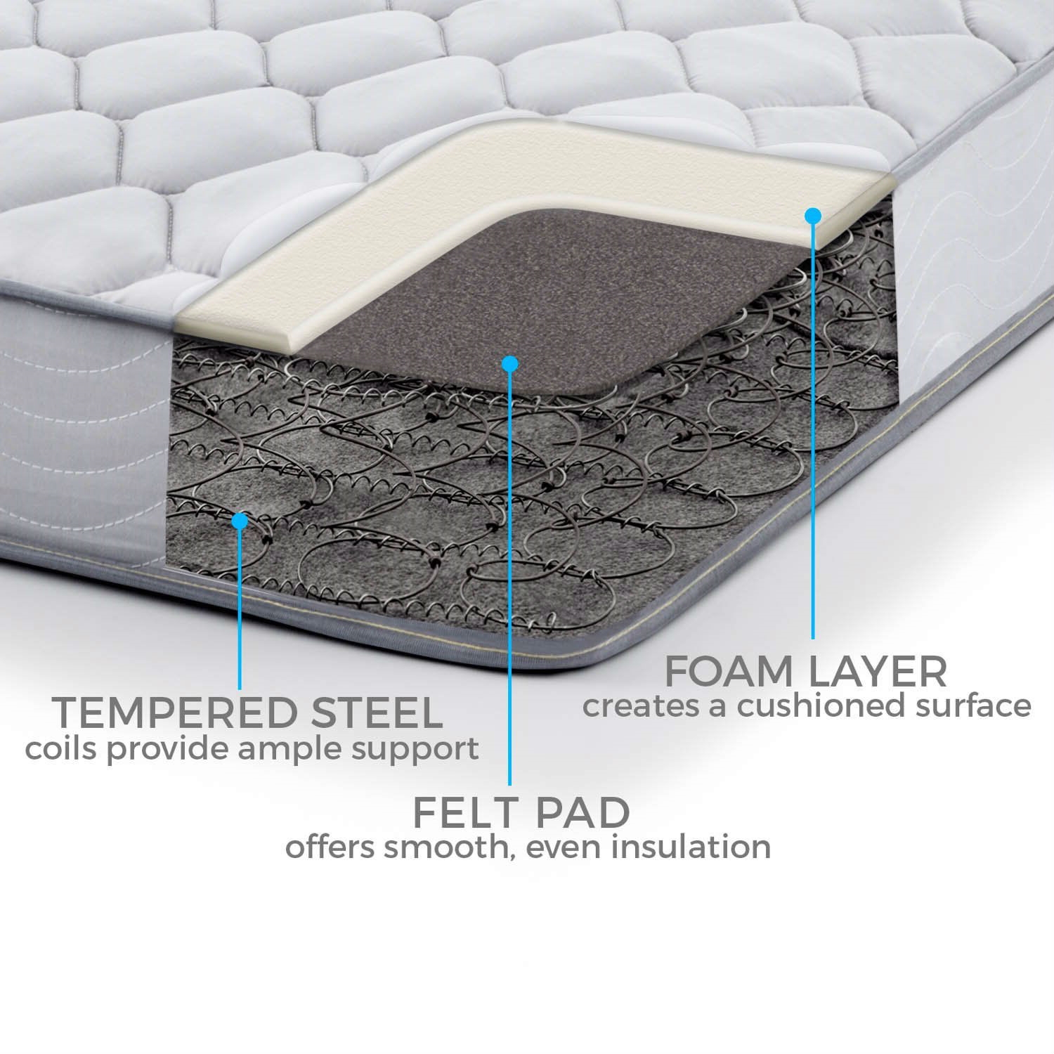 • Quilted fabric cover and foam layer above the coils offers a layer of cushioning at the surface for more comfort
